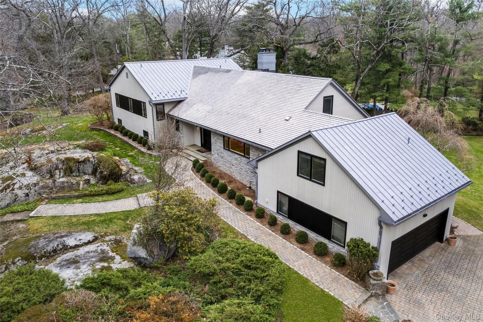 Set on a full acre in the prestigious Sterling Ridge section of Harrison, New York, this architecturally distinctive split-level residence offers 11 rooms, including 6 bedrooms and 5.1 baths, combining refined design with effortless living. Custom crafted with modern Nucedar shiplap, cedar shake siding, and a striking copper roof with lead coverings, the home has been thoughtfully updated with a newly refinished exterior and professionally redesigned front landscaping.The well-appointed kitchen with stone countertops and a sunlit breakfast area serves as the heart of the home, seamlessly supporting both everyday living and gracious entertaining. The primary suite, along with two additional bedrooms, occupies one level, while a separate bedroom, bath, and office provide exceptional flexibility for guests or private workspaces.The lower level reveals a sophisticated family room, an impressive wine cellar, and a fully self-contained guest suite, offering a luxurious retreat for extended family or visitors.A rare offering defined by scale, craftsmanship, and a premier Sterling Ridge setting.Come for a visit and stay for a lifetime.